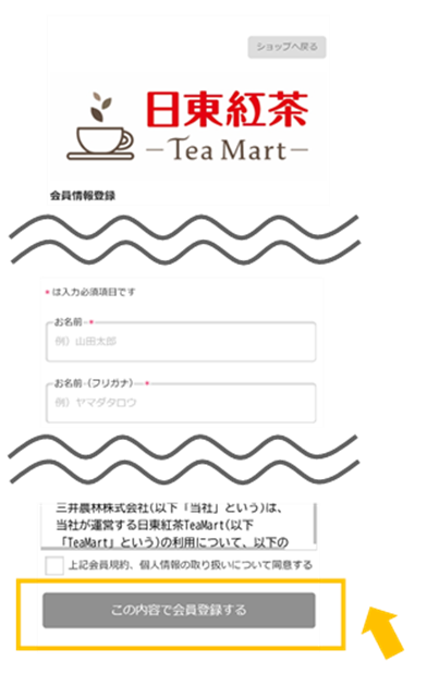 新規会員登録画面で、必要項目をご記入の上、「この内容で会員登録する」をクリックしてください。