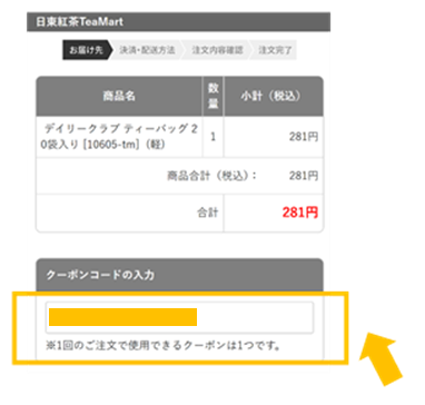 カート画面から「ご購入手続き」に進み、クーポンコードを入力してください。