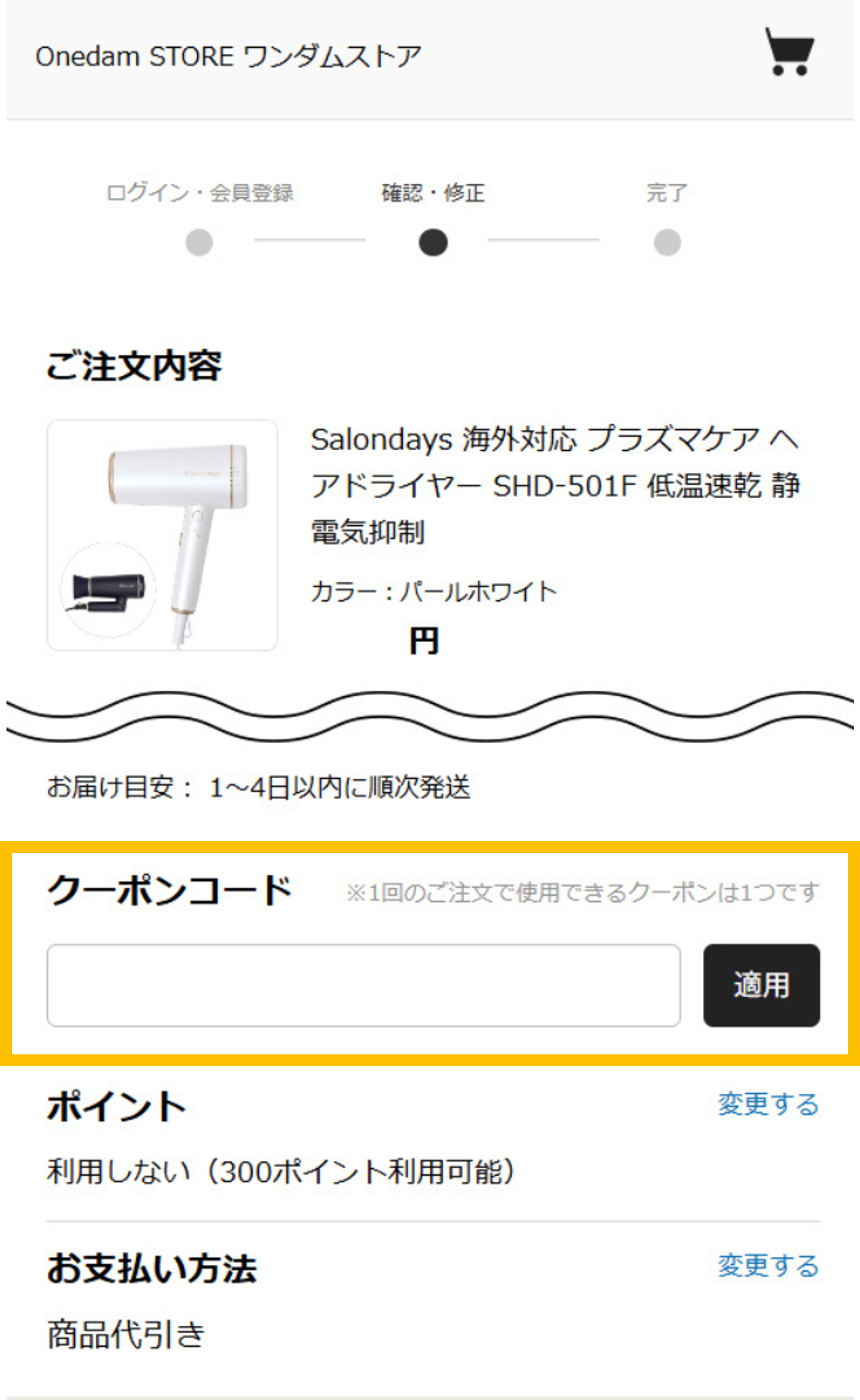 「クーポンコード」の欄にクーポンコードをご入力のうえ「適用」をタップしてください。クーポン割引額が適用されていることをご確認のうえ、「注文を確定する」をタップしてください。サロンで選ばれる理由を、あなたの日常に。